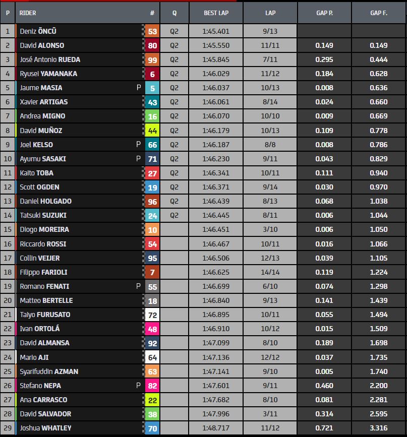 Les boiteux Kelso et Nepa en béquilles sont de retour en action, leur GP d’Espagne se poursuit après les vérifications effectuées à l’issue des deux séances du vendredi. Ça repart d’Oncu en tête avec trois Italiens (Migno, Farioli et Bertelle) provisoirement en Q2, mais c’est le tournant décisif pour décider qui ira vraiment là-bas. Nous rapportons deux incidents en séquence : Alonso chute au virage 1, Almansa au virage 2. Hier dans la chaleur de l’après-midi il y a eu peu de changements de classement, ce matin il faisait “plus frais” (19-23°C, ciel nuageux) et là Plusieurs nouveautés donc en ce qui concerne le top 14. Il y a aussi plusieurs bouleversements pour notre équipe en quête de qualification : les Snipers et les garçons de Rossi essaient, ils semblent très proches, mais au final ils restent tous à l’écart. Seul Andrea Migno réussit, Deniz Oncu commande sur les rookies David Alonso et José Antonio Rueda.