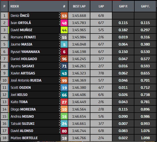 Flash yang bernilai tiang keempat di grid. Deniz Oncu mengambil kotak pertama, tetapi semuanya menunjukkan bahwa ini akan menjadi balapan yang sangat sulit. Perhatian kepada Ivan Ortola, yang baru saja meraih kemenangan Moto3 pertamanya dan yang kedua di grid, tetapi juga kepada Romano Fenati, yang menonjol hingga akhirnya menempati posisi ke-4. Apakah ini kualifikasi terbaiknya sejauh ini, apakah itu tanda pemulihan setelah tiga putaran sulit? Kami perlu mengevaluasi situasi Stefano Nepa, jauh dari tempatnya setelah cedera terakhirnya, tetapi kami juga perlu melihat bagaimana David Munoz berada, ketiga di grid tetapi protagonis dari kecelakaan buruk tepat di akhir. Waktu dan catatan kualifikasi di Jerez.
