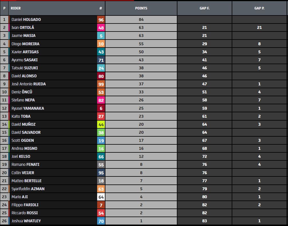 Sebenarnya tujuh: kesalahan pertama tahun ini untuk Moreira, yang jatuh di tikungan 13 dan menyambut kemungkinan konkrit podium lainnya, serta menjadi nol ganda yang pahit untuk MT Helmets-MSi. Sebaliknya, dia selalu di depan, pemimpin Moto3 Holgado, sama sekali tidak bertekad untuk melepaskannya, bahkan jika dia tidak pernah berhasil mendapatkan margin tertentu atas lawannya, sekarang tiga dengan dua lap tersisa: Sasaki, Masia dan Ortola sebenarnya. selalu ada, siap memainkan trik pada driver Tech3. Tapi kali ini tidak terkalahkan, Daniel Holgado tidak membuat kesalahan dan terbang dengan aman menuju kemenangan! Selain hadiah untuk timnya, ia juga meningkat pesat di klasemen umum: Ortola kini berada di urutan ke-2, tertinggal 21 poin. Akhirnya Sasaki, balapan bebas kesalahan yang layak podium pertama tahun 2023, sementara Jaume Masia bertahan dan melengkapi podium di garis finis. Stefano Nepa Italia terbaik, solid ke-10 (kami ingat kakinya yang buruk) dan juga satu-satunya dari kami di area poin.