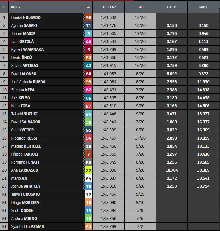 Dia memimpin di tikungan kedua dan tidak pernah melepaskannya. Daniel Holgado memberikan balapan yang luar biasa, selalu dengan para pesaingnya di belakangnya tetapi dengan kecepatan yang luar biasa, tanpa kesalahan sedikit pun. Kemenangan kedua dalam kategori juga untuk Tech3, tapi kali ini istimewa karena ini adalah acara kandang tim! Ayumu Sasaki kali ini sangat solid, dia mencoba sampai bendera kotak-kotak, tapi pemimpin Moto3 itu benar-benar tak terkalahkan hari ini. Tapi ini balapan yang bagus untuk poleman yang akhirnya menaklukkan podium pertamanya tahun ini dan menyingkirkan beberapa “hantu” setelah kecelakaan di beberapa balapan terakhir. Stefano Nepa menempati posisi 10 besar dan merupakan pebalap Italia terbaik di GP Prancis, serta satu-satunya pebalap Italia yang mampu meraih poin. Kronik acara kelima musim 2023.