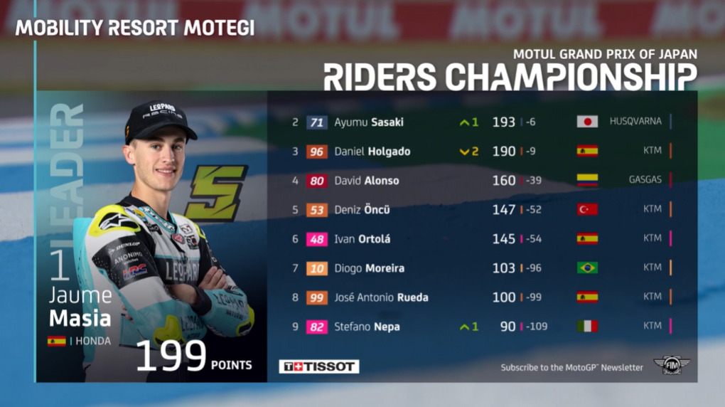 Le leader du championnat du monde Moto3 change grâce à un nouveau succès évident. La signature vient de Jaume Masia, également imbattable au Japon et, après avoir dominé toutes les épreuves, auteur d’une autre course superlative. Avec Honda, donnant ainsi une double joie au constructeur japonais à Motegi. Pour la première fois cette année Daniel Holgado doit céder la tête du classement général (et aussi la deuxième place), son compatriote de Leopard prend la tête ! Ayumu Sasaki, attristé, n’obtient pas le cliché souhaité à la maison, qu’il dédie également à sa petite amie pour son anniversaire et qui est 2ème du GP et du Championnat du Monde. Course définitivement solide pour Stefano Nepa, qui termine 4ème à l’arrivée avec 30 millièmes d’avance sur son équipier Ortola. Voici comment s’est déroulé le Grand Prix du Japon.