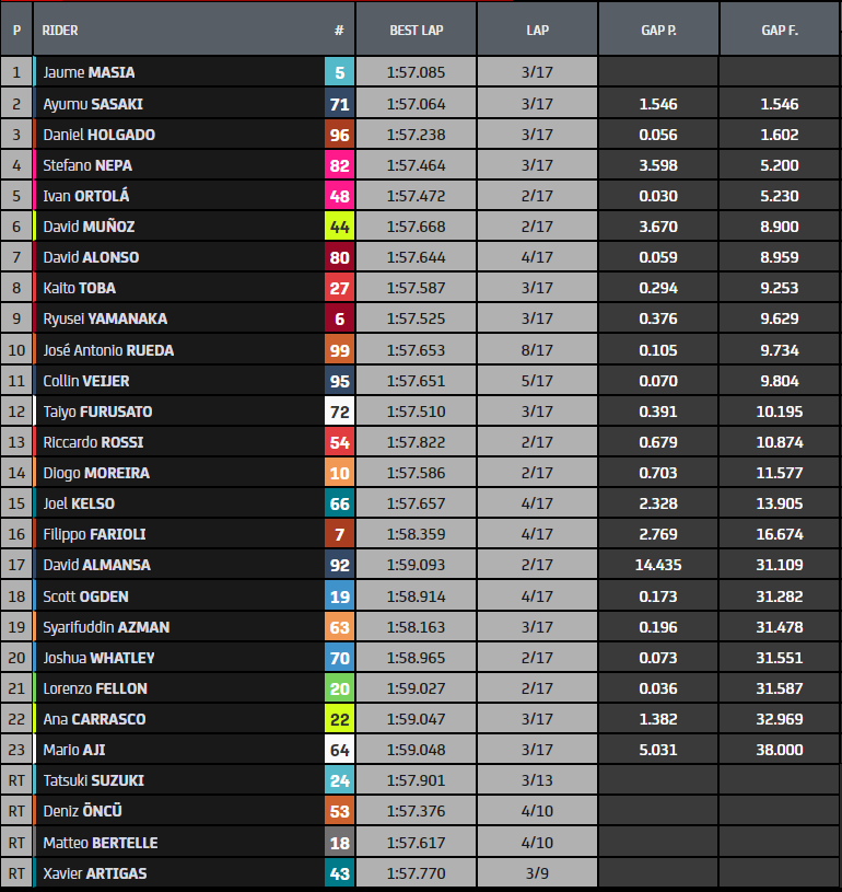 Holgado, Oncu et Nepa sont dans le top 3 au premier virage et dans les premiers tours du GP, ceci avant la récupération de Masia et Sasaki, un pilote local qui n’a pas encore gagné cette année. Et en quelques tours, il a réécrit le record absolu de la course, effaçant de 48 millièmes le record d’Alex Marquez qui durait depuis 2014. Ils sont quatre en lice pour la victoire, mais à environ une seconde se trouve le duo MTA qui regarde alors pour la récupération. Mais plus loin, à 8 tours de l’arrivée, il y a le premier abandon, celui d’Artigas suite à une chute, suivi un tour plus tard par celui de Bertelle, qui a connu une course difficile dès le départ et a chuté à moins de dix tours de la fin. Mais le rebondissement arrive plus tard…