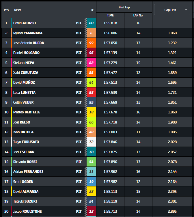 Να θυμίσουμε ότι χθες έφτασε εκπληκτικά η πρώτη μεταγραφική είδηση στην κατηγορία, δηλαδή η υπογραφή του Joel Kelso με το MTA για τη σεζόν 2025 (λεπτομέρειες). Θα δούμε λοιπόν ποιο θα είναι το μέλλον του Stefano Nepa και του rookie Nicola Carraro… Κοιτάζοντας την πίστα, το Moto3 ξεκινά το Σαββατοκύριακο στο Mugello ανάμεσα σε μπαλώματα που είναι ακόμα υγρά μετά τη χθεσινή βροχή. Χωρίς να προλάβει καν να ξεκινήσει καθώς ο Dettwiler έπρεπε να απομακρυνθεί αργά από την πίστα, σταμάτησε από ένα τεχνικό πρόβλημα, φαινόταν επίσης να υπάρχουν κάποιες δυσκολίες για τον Carraro στο δεύτερο μέρος της συνεδρίας, το οποίο ήταν σύντομο δεδομένου ότι στη συνέχεια κατάφερε να ξεκινήσει ξανά. . Ωστόσο, αυτό που για άλλη μια φορά φαίνεται ξεκάθαρο είναι ότι ο David Alonso απελευθερώνεται: ο νεαρός Κολομβιανός στην πραγματικότητα συνθέτει μια σειρά τρομακτικών γύρων, ξαναγράφοντας το απόλυτο ρεκόρ Moto3 στο Mugello αρκετές φορές. Κανείς δεν μπορεί ούτε να τον πλησιάσει, κοίτα τα κενά…