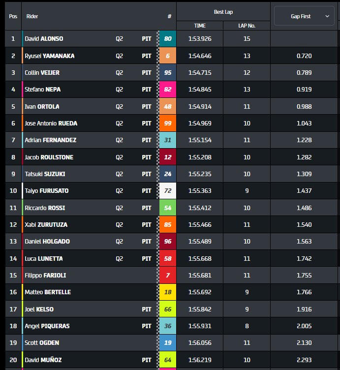 Chúng ta bắt đầu lại từ những gì chúng ta đã thấy chiều hôm qua, với sự chỉ huy của Alonso không thể ngăn cản (thời gian và tin tức). Đây là phiên Moto3 mang tính quyết định, mặt trời đang chiếu sáng ở Mugello và nhiệt độ là 16-21° C, do đó có thể sớm thấy một số cải thiện trên bảng xếp hạng. Ngay cả khi không đủ để cải thiện thành tích đã bị tay vợt người Colombia đến từ Aspar phá vỡ hai lần vào thứ Sáu, ít nhất là vào lúc này… Trên bảng tỷ số, ở những phút cuối cùng, một tai nạn xảy ra với Almansa ở Biondetti thứ hai, không gây hậu quả, trong khi trận chung kết cuộc tấn công cho quý 2. Một lần nữa, David Alonso đã trở lại, một lần nữa tăng tốc và thực hiện một loạt vòng đua phá kỷ lục giúp anh có quyền truy cập trực tiếp vào Q2 với tư cách là tay đua để đánh bại.