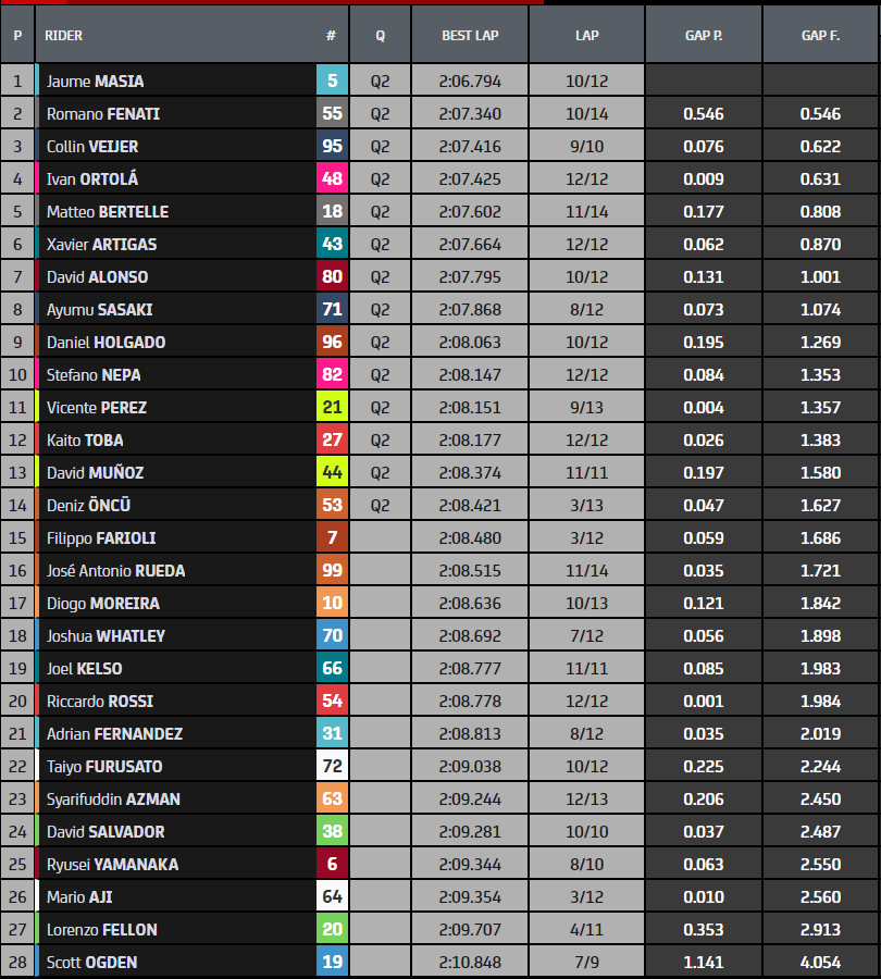 Il fait désormais nuit sur le circuit international de Lusail, nous courons sous des lumières artificielles. Comme toujours, une situation nettement différente de celle observée lors des essais 1. Les temps commencent immédiatement à baisser, entraînant bientôt un bouleversement radical du classement constaté lors de la manche précédente. Sur la feuille de match, une chute d’Alonso au virage 6, sans conséquences, alors que tous les Italiens entrent provisoirement dans le top 14. Parmi eux, se distingue particulièrement Romano Fenati, qui réalise une série de tours rapides qui lui permettent de s’envoler temporairement vers en tête du classement. Entre Oncu et Rueda, il y a cependant un autre moment inattendu qui n’aide pas le pilote turc, plutôt agacé par un épisode qui se retrouve sous la loupe de la Direction de Course. Mais pour le moment, l’attention se porte aussi entre Farioli, lent sur la trajectoire, et Masia, arrivant à plein régime mais ralenti par la recrue italienne. Sur le constat d’accident de Veijer, Ogden, Yamanaka, ainsi que des jeux de sillage qui n’arrangent rien et un deuxième épisode douteux entre Rueda et Oncu… Devant, sans trop de problèmes, se trouve le leader Moto3, deuxième Fenati , qui comme Bertelle et Nepa gagne le top 14 provisoire.