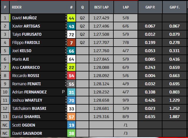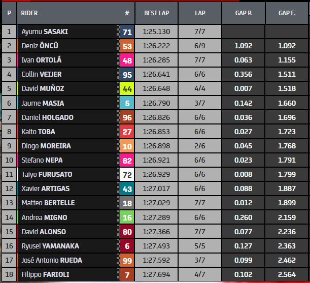 Keempatnya bergabung dengan 14 pebalap lain yang telah lolos, sehingga memulai perebutan posisi terdepan di Sachsenring. Dan Ayumu Sasaki sudah memperjelas bahwa dia ingin mengamankannya: dia segera memimpin, meninggalkan Oncu ke-2 lebih dari setengah detik di belakang. Pengendara KTM Ajo tidak fit, dia membagi dua jarak… Tapi dia tidak bisa melangkah lebih jauh, juga karena Sasaki menyesuaikan waktunya lagi: kali ini pengejar pertama berjarak lebih dari satu detik! Deniz Oncu dan Ivan Ortola melengkapi barisan depan, bukan rookie buruk Collin Veijer ke-4! Dari pebalap Italia, hanya Nepa yang finis di 10 besar, tetapi seperti dia, Bertelle, Migno, dan Farioli juga akan mencoba bermain untuk itu besok dalam balapan.