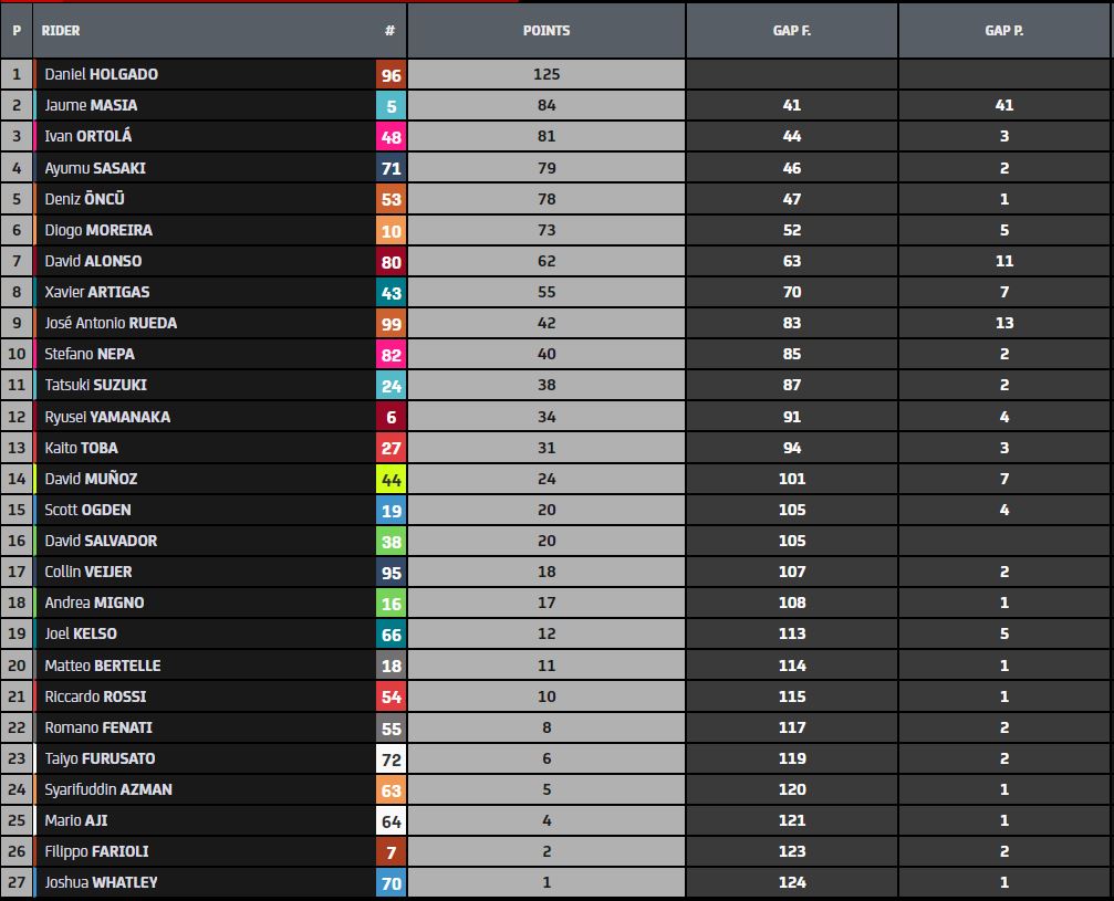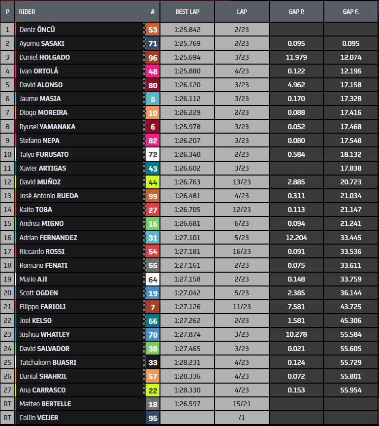 Nyatanya, Sasaki hanya akan mencoba dari lap pertama, tapi ada seseorang di belakangnya yang tidak terlalu setuju. Oncu, Holgado dan Ortola mencoba untuk membatasi kerusakan bersama-sama, sampai pembawa standar KTM Ajo menyalakan turbo: dia meninggalkan kedua rekannya dari jarak jauh dan membatalkan jarak yang awalnya diakumulasikan oleh pemimpin balapan. 5 detik kemudian ada grup lain, dengan Nepa juga protagonis yang agresif dalam comeback, meski sayangnya jarak dari pemimpin klasemen sudah jauh… Balapan Farioli kemudian menjadi lebih rumit, tidak jauh dari zona poin hingga Long Lap karena keterbatasan jalur. Hukuman ganda karena tidak menyajikannya dengan benar! Di depan malah kita amati Oncu yang, selama pertandingan, memijat kaki kirinya beberapa kali: tidak sempurna di tempatnya, tapi dia tidak menyerah pada Sasaki. Ini lap terakhir, tikungan terakhir, Deniz Oncu kali ini tidak membuat kesalahan dan melancarkan serangan: saingannya diejek, inilah kemenangan pertama yang dirindukan pembalap Turki itu! Di papan skor di lap terakhir kecelakaan malang Bertelle, penulis comeback super hingga posisi 8… Artigas malah terdegradasi satu posisi karena keterbatasan trek di lap terakhir.