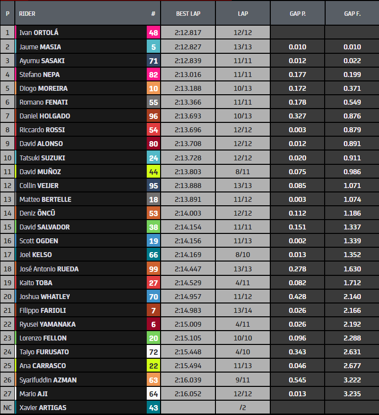Ας ξεκινήσουμε από τον Daniel Holgado, κορυφαίο της βαθμολογίας και αποφασισμένος να ακυρώσει τον κακό γύρο στο Assen, το πρώτο μηδέν της σεζόν του. Προσοχή στους αντιπάλους που είναι έτοιμοι να επιτεθούν, υπάρχει πολύς δρόμος ακόμα, αλλά τώρα αρχίζουμε να σοβαρευόμαστε λίγο. Η Moto3 πήγε επίσης διακοπές με δύο Ιταλούς συγκεκριμένα στις ασπίδες, τον Στέφανο Νέπα και τον Ρομάνο Φενάτι: θα επιβεβαιωθούν; Στο μεταξύ, ας δούμε την πίστα, με το πρώτο ατύχημα του Σαββατοκύριακου να φτάνει μετά από περίπου δέκα λεπτά: ο πρωταγωνιστής Τσάβι Αρτίγκας, με χαλασμένες φόρμες και μηχανάκι αλλά ξέφυγε στα πόδια, αν και κουτσαίνοντας. Λίγα λεπτά αργότερα ο David Munoz τράκαρε επίσης, επίσης στο φύλλο αγώνα ένα τρακάρισμα για τον Ryusei Yamanaka στη στροφή 7. Ακόμα στο ίδιο σημείο θα υπάρξει ένα highside για τον Taiyo Furusato, ευτυχώς χωρίς συνέπειες, αλλά το οποίο σηματοδοτεί το τέλος της συνεδρίας του λιγότερο από τρεις λεπτά από την καρό σημαία.