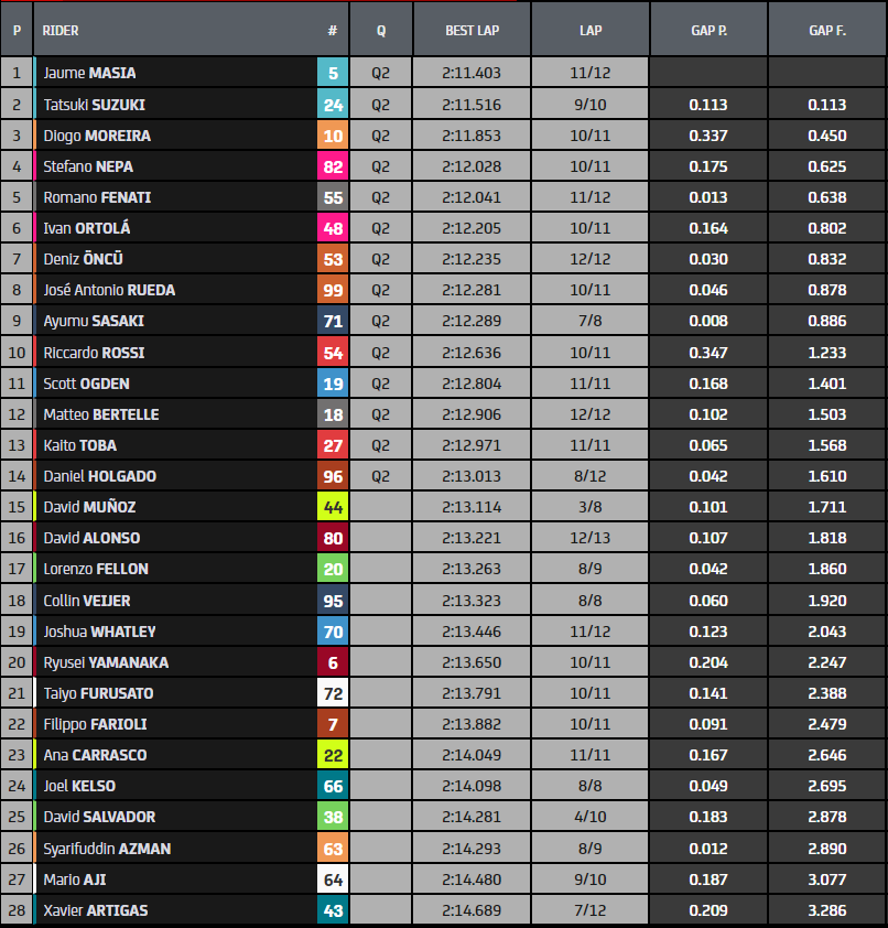 Ξεκινά ξανά από το σημερινό αγόρι γενεθλίων, τον πρόσφατα 19χρονο Ivan Ortola, που οδηγεί τη βαθμολογία, με τους Stefano Nepa, Romano Fenati και Riccardo Rossi στους 10 (η αναφορά από την πρακτική 1). Η δραστηριότητα ξεκινά αμέσως: υπάρχει φόβος βροχής αύριο για την Εξάσκηση 3, αυτή η συνεδρία Moto3 θα μπορούσε επομένως να αποδειχθεί καθοριστική όσον αφορά τις κατατακτήριες. Και δεν ξεκίνησε καλά για τον Sasaki, ο οποίος τράκαρε στη στροφή 11 μετά από λίγα λεπτά, ενώ όσο περνούν τα λεπτά αρχίζουμε να βλέπουμε κάποιες αλλαγές. Όπως ο Oncu που ανεβαίνει ξανά σε μια πιο «άνετη» θέση, ή ο Jaume Masia που απομακρύνει τον συμπατριώτη του από την κορυφή, ή ακόμα και τα αγόρια των Snipers που δουλεύουν μαζί για να μειώσουν τους χρόνους τους. Αλλά είναι στα τελευταία λεπτά που έχουμε την πραγματική επίθεση στον καλύτερο χρόνο γύρου όχι μόνο της συνεδρίας, αλλά της Παρασκευής στο Silverstone. Μόνο που ο Σαλβαδόρ δεν βελτιώνεται σε σχέση με το πρωί, αντίθετα το ζεύγος Λεοπάρ τοποθετείται μπροστά. Παραδόξως, ο ηγέτης του Moto3 Holgado συνεχίζει να αγωνίζεται, τελειώνοντας την Παρασκευή στην τελευταία διαθέσιμη θέση για το Q2.