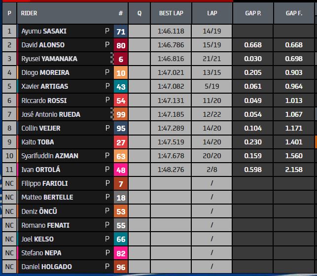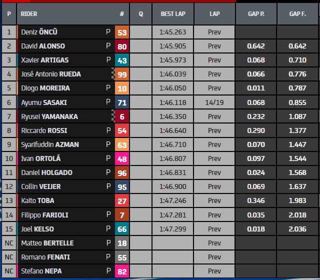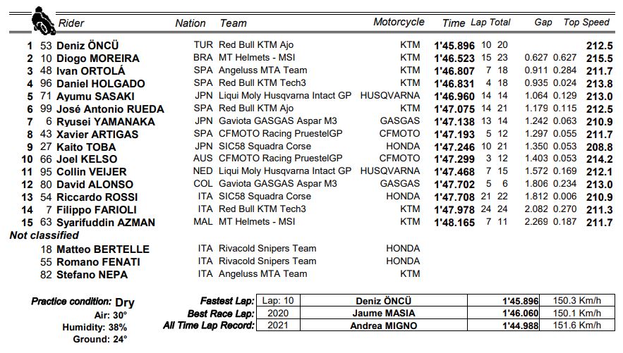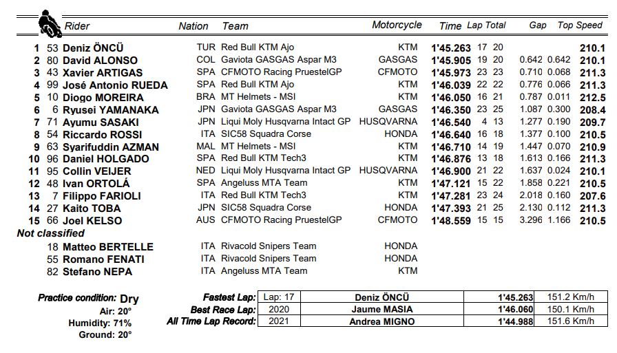 Après le MotoGP, place à l’unique journée d’essais également pour les classes mineures. La catégorie Moto3 a été l’avant-garde de la journée, même si la grille n’était pas complète puisqu’il y avait 15 pilotes en piste. Seuls deux garçons italiens au classement, à savoir Riccardo Rossi, à la poursuite de la percée (deux points en 4 GP) et le la recrue Filippo Farioli, qui a plutôt conquis hier les premiers points du championnat du monde. Le meilleur de la journée est Deniz Oncu, autre coureur à la recherche de l’équipe en début de championnat et auteur d’un contre-la-montre en dessous du record de la course. Sur la feuille de match quelques incidents dans la journée, comme pour les rookies Alonso, Azman et Veijer, Toba s’est également glissé dans la dernière séance du jour. Trois séances terminées, soit 9h30-10h40, 12h10-13h30, 14h50-16h05, voici les classements Moto3 de cette journée d’essais.