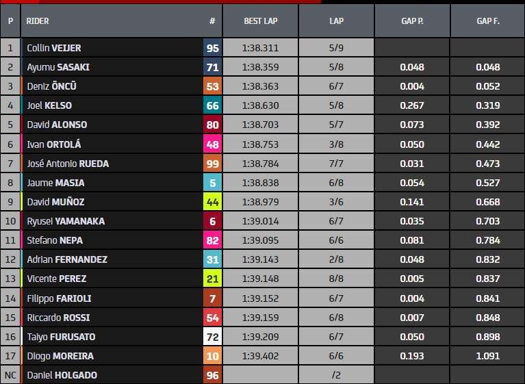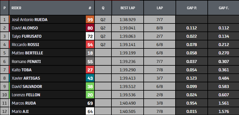 Nous avons ainsi les noms des 18 pilotes qui concourront pour la première place sur la grille, parmi lesquels le nouveau champion Moto3 et trois Italiens. Cependant, la feuille de match comprend également un highside pour Daniel Holgado au virage 11 à 7 minutes de la fin : pilote ok, mais son assaut vers la pole devient considérablement plus compliqué.