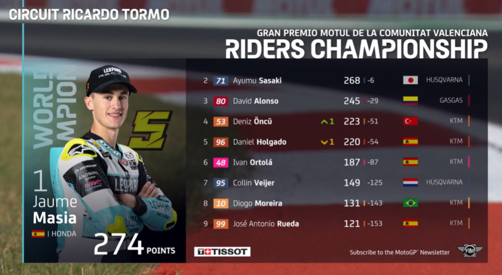 La dernière course de 2023 démarre, mais on signale immédiatement un multiple accident : à Doohan Moreira et Perez finissent au sol, Holgado finissant très large et revenant presque à l’arrière. Tout cela à cause d’Artigas, qui peu après reçoit un double Long Lap pour conduite irresponsable. Quelques tours et voilà la fin de la course pour Fellon, highside au virage 5. Pendant ce temps, les garçons d’Intact GP et d’Oncu dictent le rythme, mais bientôt Alonso, Kelso, Ortola et Rueda rattrapent également leur retard. Plus loin cependant, le nouveau champion Moto3 Masia, en lutte avec Munoz pour la huitième place : un duo qui se détache de plus en plus du podium et est en fait rattrapé par ses poursuivants. Sauf bouleversement, on ne verra pas le nouveau champion sur le podium lors de son dernier GP Moto3…