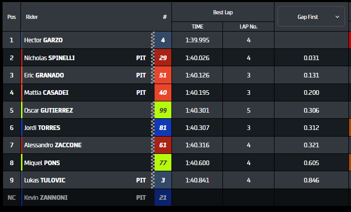 Zannoni ne peut cependant pas participer à la séance : sa MotoE est endommagée et il n’y a pas assez de temps pour en préparer une autre… C’est une séance très rapide, le premier 1:39 arrive signé par Hector Garzo, qui prend finalement la pole position définitive ! Première fois devant tout le monde en qualifications pour le pilote Intact GP, Nicholas Spinelli 2ème et meilleur italien sur la grille pour les deux courses de demain.