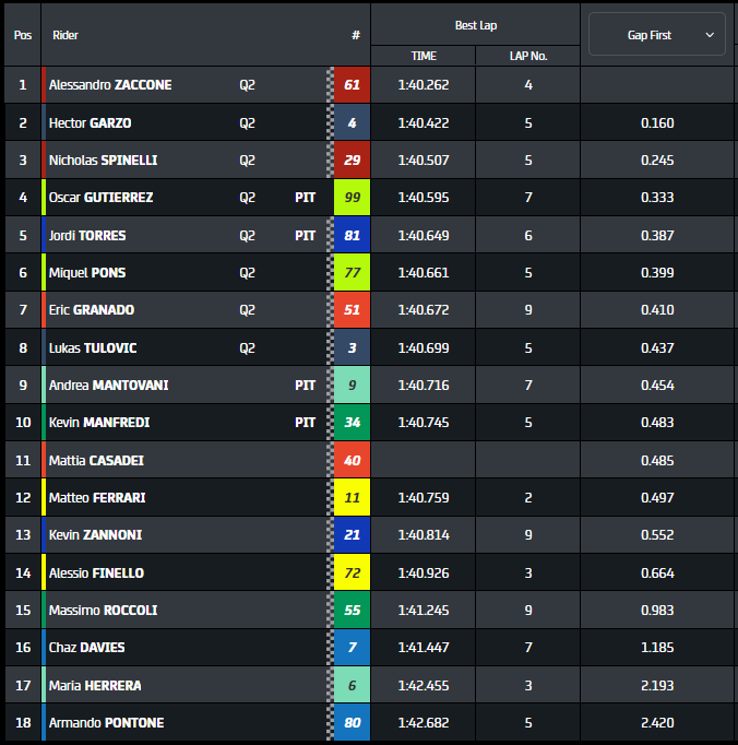 Séance décisive pour décider des noms des 8 premiers pilotes qui accèderont directement à la Q2. Les surprises ne manquent pas, notamment le champion en titre de MotoE Mattia Casadei, ainsi que la majorité des Italiens. Seuls Zaccone et Spinelli, pilotes de l’équipe locale Tech3, obtiennent une qualification directe.