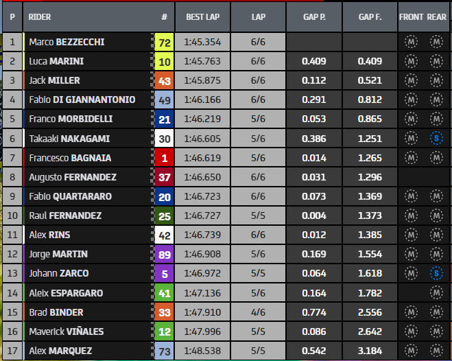 La première (mauvaise) nouvelle est déjà tombée : le Team Repsol Honda est à l’arrêt complet aujourd’hui, Joan Mir a été déclaré inapte après le violent highside du début du MotoGP Sprint. Autre nouvelle pas franchement positive, la pluie est de retour, donc le warm up avant la course se déroulera dans ces conditions. A voir donc pour la course argentine de l’après-midi, si ça continue on pourrait avoir une course encore plus imprévisible qu’hier ! Mais on verra ça dans les prochaines heures, en attendant l’échauffement humide récompense Marco Bezzecchi. “Mais je préfère le sec” cependant, le pilote VR46 a admis, menant son coéquipier Luca Marini et Jack Miller.
