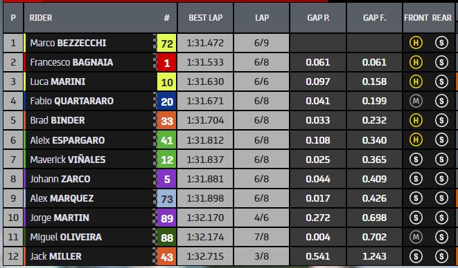 Dengan kesulitan Marquez juga, kami tidak memiliki Honda di sesi ini. Sebaliknya, ada enam Ducati, dua KTM, dua Aprilia, dan Yamaha Quartararo yang siap untuk pertarungan terakhir memperebutkan posisi terdepan di Assen. Masalah langsung bagaimanapun untuk Martin yang jatuh di tikungan Strubben, The Reds lainnya langsung memimpin klasemen. Upaya luar biasa oleh Quartararo, yang memimpin sebentar dan kemudian memberi jalan kepada pasukan merah, bahkan jika ia mengambil posisi akhir ke-4 yang sangat baik. Marini, sebaliknya, adalah protagonis kecelakaan di Stekkenwal pada menit terakhir yang tersedia, tetapi masih bertahan di barisan depan, di belakang poleman Marco Bezzecchi dan Francesco Bagnaia di urutan ke-2.