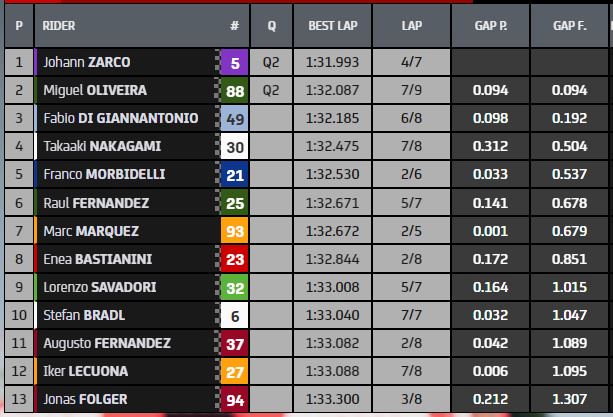 Dua kejutan The Reds di sesi kualifikasi pertama ini, yakni Johann Zarco dan Enea Bastianini. Sayangnya, semakin tidak mengejutkan menemukan Marc Marquez, perwakilan Honda dalam kesulitan antara setengah dari pengendara yang cedera dan rumit untuk mengelola RC-V. Miguel Oliveira juga muncul, mengalahkan Aprilia di Jerman meskipun fisiknya bermasalah, dan didukung oleh banyak penggemar di GP Assen ini. Tapi klasemen mengkristal sebelum bendera kotak-kotak: baik Bastianini dan Marquez “terganggu”, sebuah fakta yang menyebabkan kecelakaan antara RC-V dan Desmosedici. Pengemudi baik-baik saja, tetapi banyak lap terakhir dibatalkan oleh bendera kuning: Johann Zarco dan Miguel Oliveira tetap melaju ke Q2.