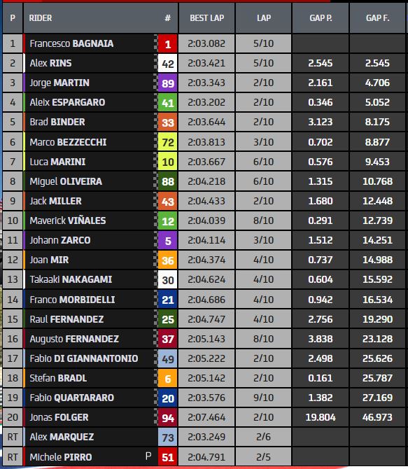 Pilihan karet yang bulat, semuanya dengan kombinasi keras-lembut. Ayo pergi, tembakan bagus dari Bagnaia sampai Rins mencoba kudeta, mempertaruhkan banyak hal dan akhirnya menyusul pembalap Ducati itu. Tapi itu berlangsung beberapa tikungan, pengendara LCR mencoba lagi dan melewati di depan, namun Bagnaia mendorong Ducati-nya dan berhasil mengatur #42 yang galak yang tidak menyerah. Namun, ada juga Espargaro, Quartararo, duo Pramac dan Marquez (yang memulai dengan buruk) siap bergabung. Namun, pertarungan di puncak tidak berlangsung lama, Bagnaia justru langsung mendapatkan margin tertentu atas lawan-lawannya, sementara petaka melanda di belakang: Quartararo tumbang di turn 1! Dia berhasil memulai kembali, tetapi Sprint sudah dikompromikan. Pirro juga jatuh di titik yang sama, dia juga pergi tetapi jatuh di belakang grup. Nol pertama tiba untuk Alex Marquez, yang jatuh di tikungan ke-12 saat dia berada di urutan ke-5 dan terpaksa mundur. Pecco Bagnaia Tak Punya Saingan, Ini Reaksi Cepat Pasca Kecelakaan di Argentina! Tapi di belakang Alex Rins dia membuat balapan super dan finis ke-2, dengan Jorge Martin ketiga setelah menyesuaikan Aleix Espargaro.
