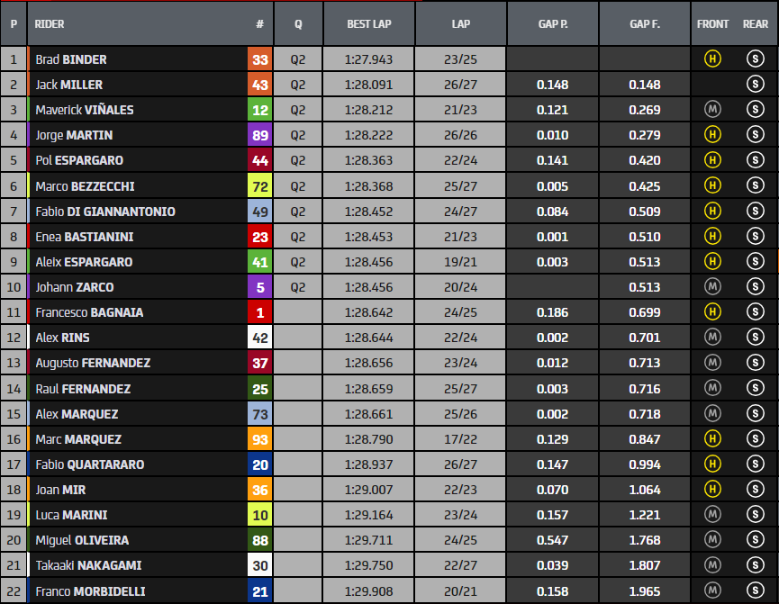 L’épreuve la plus longue, mais aussi la plus importante pour la catégorie reine, puisque c’est ici que sont décidés les 10 noms qui accèdent directement à la deuxième séance de qualification. Toutes les voitures KTM/GASGAS démarrent très bien, y compris les Ducati (pas celle du champion MotoGP) et les Aprilia, tandis que Marc Marquez se situe juste en dehors du top 10. La situation se complique pour lui en peu de temps : après le “record” des Tests 1 le multiple champion Honda retouche le record de chutes, malgré la tentative de sauvetage…