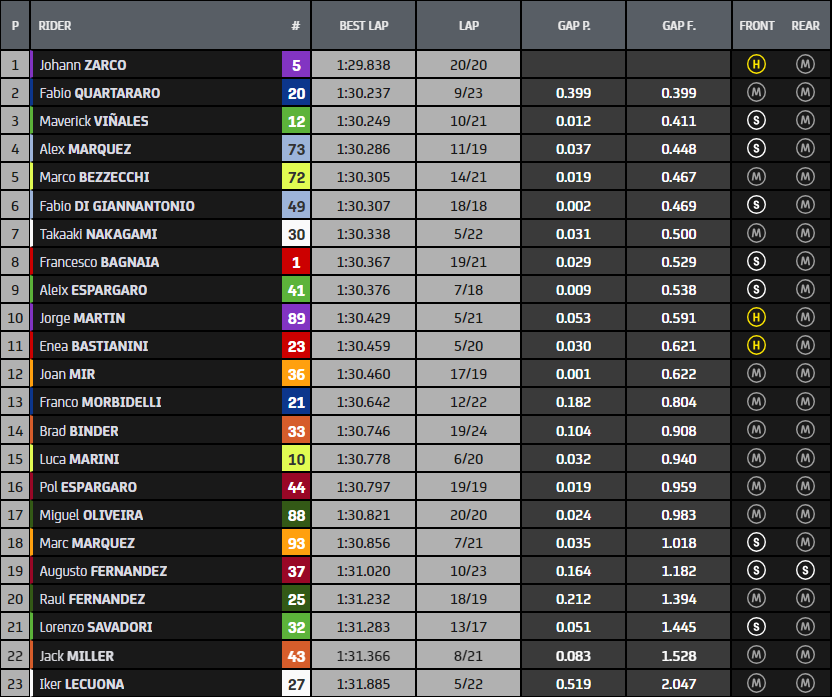 Δεν είναι η καλύτερη αρχή για τον Alex Marquez: μερικές στροφές και υπάρχει ένας περίεργος λευκός καπνός από τον μπροστινό τροχό του Desmosedici του. Μικρό στην αρχή, μετά όλο και πιο σημαντικό, ώσπου ο οδηγός του Gresini να καταλάβει το μπελά και να σταματήσει στην άκρη της πίστας. Πρόβλημα λόγω διαρροής υγρού ως αποτέλεσμα σπασμένου στεγανοποιητικού λαδιού στο πόδι του πιρουνιού. Ο Marc Marquez, από την άλλη, είχε ήδη προβλέψει χθες στη συνέντευξη Τύπου ότι ξεκινώντας από αυτή τη συνεδρία θα δοκιμάσει το νέο αεροδυναμικό πακέτο που έφερε η Honda, διαθέσιμο τόσο σε αυτόν όσο και στον Joan Mir. Όχι το μοναδικό, ο Fabio Quartararo και η Yamaha έχουν επίσης ένα νέο αεροδυναμικό πακέτο για αυτό το Grand Prix, μια καινοτομία που ο παγκόσμιος πρωταθλητής MotoGP του 2021 δεν διστάζει να δοκιμάσει αμέσως. Ένα τεστ που του επιτρέπει να πετάξει στην πρώτη θέση, εκδιώκοντας τον Vinales αρχικά στην κορυφή της βαθμολογίας. Στο φύλλο αγώνα ένα ατύχημα για τον Marc Marquez στα τελευταία λεπτά, ένα τρακάρισμα στη στροφή 4 μετά από ένα ελαφρύ πέρασμα στο χαλίκι.