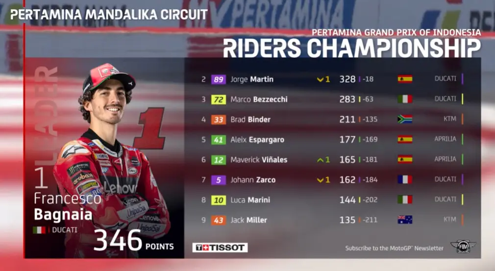 Une erreur inattendue de Jorge Martin provoque un bouleversement important. Francesco Bagnaia n’a pas besoin d’attendre : il profite de l’occasion avec une remontée et une victoire, reprenant ainsi la tête du championnat. Il convient de souligner les tentatives de Maverick Vinales et Fabio Quartararo jusqu’au bout, qui ont mis une forte pression sur le champion en titre finalement victorieux jusqu’au drapeau à damier. Quel coup dur pour un Fabio Di Giannantonio ému, solide 4ème, mais aussi meilleur pilote privé et meilleur classement personnel en MotoGP. Super week-end pour Marco Bezzecchi 5ème aujourd’hui, GP à oublier pour Marc Marquez, mais les chutes sont nombreuses au compteur. Voici comment s’est déroulé le Grand Prix d’Indonésie.