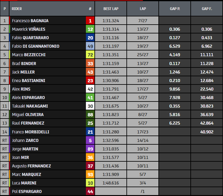 Luca Marini et Enea Bastianini ont chacun un Long Lap à servir, mais après le mauvais départ (10 positions perdues) la catastrophe a frappé le poleman du VR46, qui s’est retrouvé au sol après un contact avec Binder. Le pilote KTM, auteur d’une tentative de dépassement trop “joyeuse”, se verra en effet écoper d’un Long Lap pour conduite irresponsable. La course de Pol Espargaro se termine suite à une chute, tandis que Franco Morbidelli rentre au garage après seulement un tour. Double zéro plutôt pour Marc Marquez, qui a encore chuté après le MotoGP Sprint : le multiple champion Honda ne cache pas un sentiment de frustration, il s’accrochait au top 10…