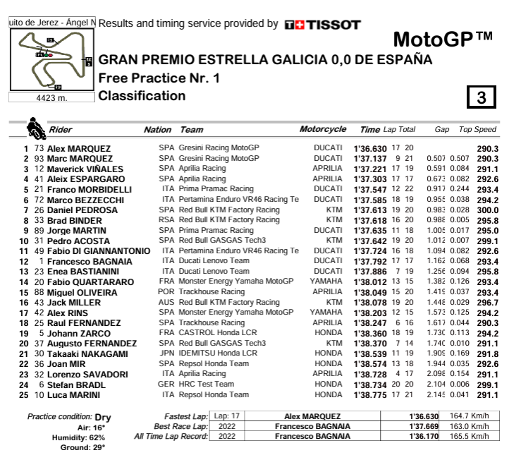 Marc Marquez, quant à lui, immédiatement doté d’un nouveau levier de frein, prenait la tête du classement à une demi-heure de la fin, suivi de son frère Alex. Pedrosa, bien qu’occupé par les tests aérodynamiques de sa RC16, reste fermement dans le top 10. Dans les dernières minutes, un deuxième accident se produit, celui d’Augusto Fernández au virage 2, sans conséquences. La dernière attaque récompense Alex Marquez, le seul en action à la fin avec le nouveau double soft (tous les autres ont opté pour le soft-medium) et prend la tête devant son frère Marc et Maverick Vinales.