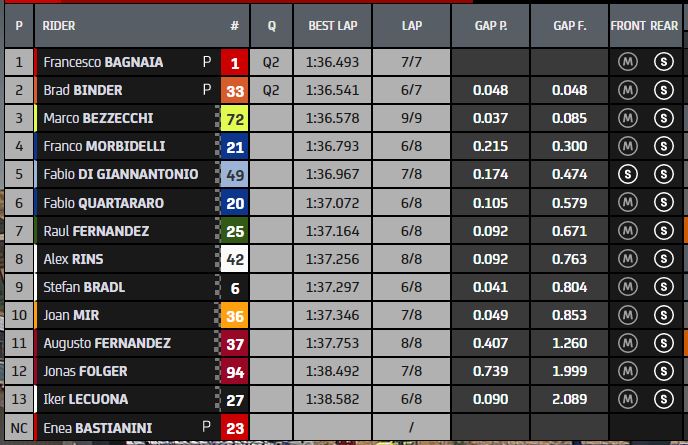 Phiên bắt đầu, một số chọn lốp xe mưa và những người khác đang trên đường đua với vết loang. Một sự kiện bất ngờ có thể làm xáo trộn các giá trị hơn nữa trong phiên giao dịch quyết định này. Vị trí quan trọng nhất là vị trí cực, nói chung là top 12 cho cả MotoGP Sprint và cho chặng đua dài vào Chủ nhật. Sau một khởi đầu thận trọng, trận chiến sẽ diễn ra với những chiếc lốp khô cho tất cả mọi người: thời gian cải thiện khi từng giây trôi qua, đó là một phiên thực sự thú vị và không thể đoán trước.