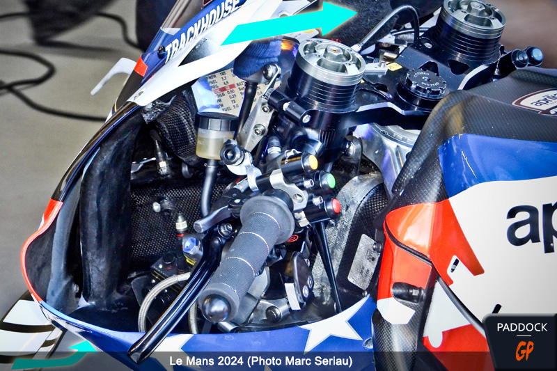 Nous avons cependant réussi à détailler les deux conduits qui prélèvent l’air devant le radiateur pour l’évacuer sur la partie supérieure du carénage, afin de privilégier l’aérodynamisme des pilotes MotoGP. Un sujet auquel Aprilia accorde beaucoup d’attention (même avec ses brevets).