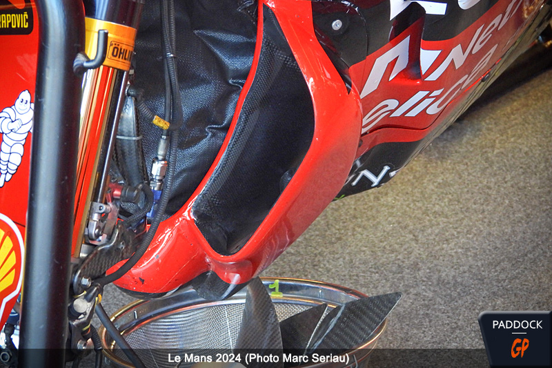 L’intérieur des Downwash Ducts de Team Gresini et ses ailerons internes massifs sont peints en noir (comme ceux de 2024). On voit mieux la différence avec les éléments 2024 sur les vélos du team VR46…