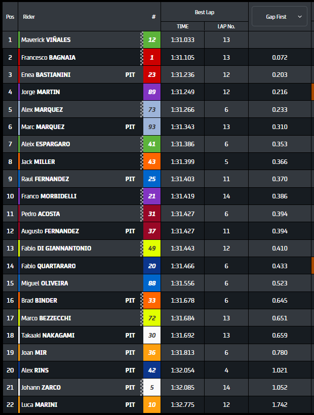 Cela ressemble à une séance Ducati, mais voici Maverick Vinales. Au final, le porte-drapeau d’Aprilia s’est installé en tête du classement MotoGP et y est resté jusqu’au drapeau à damier. Derrière lui on retrouve un joli groupe Ducati, à commencer par le champion en titre Francesco Bagnaia, son équipier Enea Bastianini, Jorge Martin et les Marquezes. Une Aprilia devant les Reds, un avant-goût de ce que l’on verra bientôt en qualifications ? Voici comment s’est déroulée la séance sur le Circuit Bugatti.