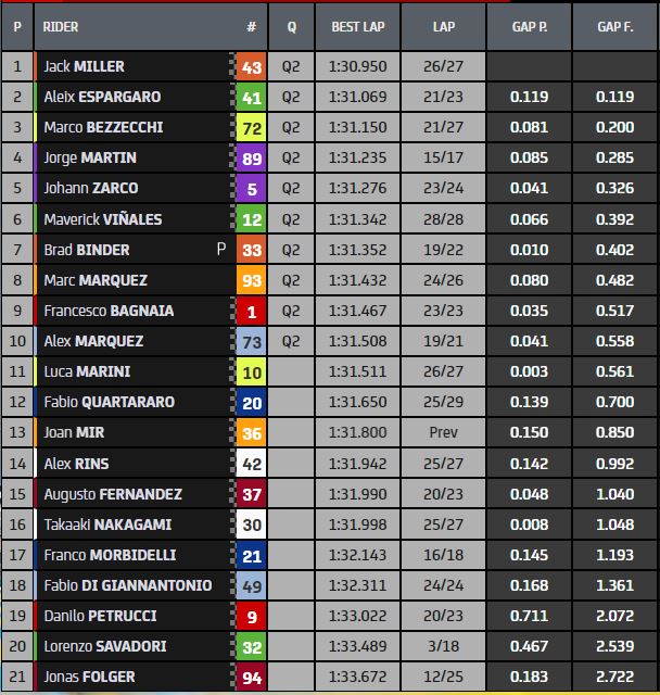 Ini putaran yang agak bergelombang, penuh dengan jatuh secara berurutan. Hanya di 10 menit pertama Espargaro, Morbidelli, Savadori, Mir, Augusto Fernandez dan Alex Marquez berakhir di lapangan, diikuti oleh Martin dan Petrucci. Angin semakin kencang dan langit semakin gelap, tetapi sesi ini tidak hujan. Ada juga beberapa “sentakan” penting untuk Quartararo, mencari 10 besar dan karena itu akses langsung ke Q2. Dan dia bukan satu-satunya, Bagnaia juga menyelinap keluar! Menit-menit terakhir yang gemerlap, ada 10 posisi yang harus diamankan dan banyak yang menginginkannya. Tapi ada beberapa kejutan lagi dan itu bukan Marc Marquez, di Q2 meskipun crash terakhir: semua waktu di bawah.