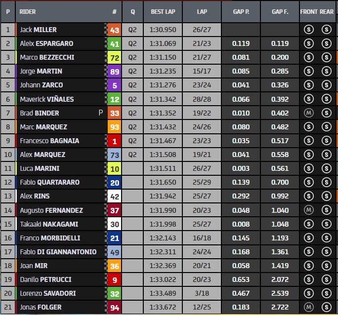 Di sesi pagi KTM menempatkan kaki dengan Jack Miller dan Brad Binder hanya dipisahkan oleh Luca Marini sebagai komando. Perlu dicatat bahwa sekarang semua KTM/GASGAS, termasuk rookie Augusto Fernandez, memiliki sayap ‘persegi panjang’ di bagian ekor yang dibawa ke Jerez oleh test rider Pedrosa. Pagi hari dengan kecelakaan bagi Marc Marquez, untungnya tanpa konsekuensi bagi pebalap Repsol Honda itu. Seperti rekan setimnya Joan Mir, dia telah memiliki kesempatan untuk menguji sasis KALEX baru, dalam kasusnya untuk pertama kalinya karena absen dari tes Jerez.