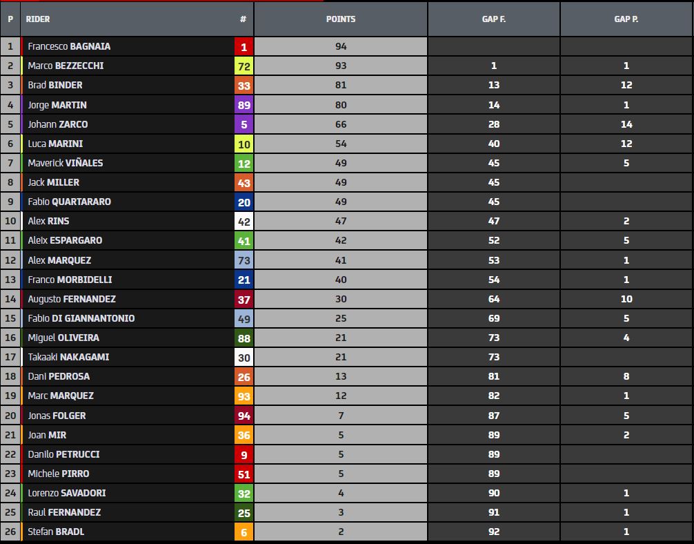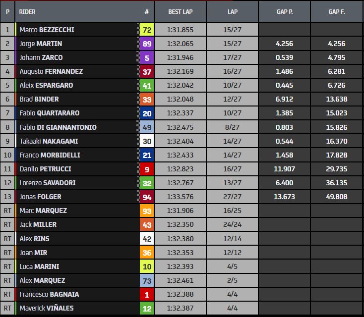 Miller, Bezzecchi, Marquez dan Martin memegang kendali, memang mereka mengobarkan balapan dengan menyalip dan menyalip balik secara konstan, tetapi juga berhati-hati sedikit lebih jauh ke belakang. Zarco, Augusto Fernandez dan Espargaro yang luar biasa, ditambah Binder beberapa persepuluh, naik kembali, bertekad untuk bergabung dengan pesta. Sementara itu, periode bencana Mir berlanjut, saat ia mundur karena kecelakaan lagi 14 lap sebelum akhir, sementara Miller sayangnya melepaskan diri, ia mulai kehilangan lebih banyak posisi… Penyelesaian yang memalukan juga untuk Alex Rins, yang jatuh di tikungan ke-9, sementara di depan ia berisiko besar juga Marquez, yang masih menempati posisi kedua di depan Martin. Ini bukan hari untuk Binder, juga dikenai Penalti Lap Panjang untuk pemotongan antara tikungan 9-10, atau untuk Miller yang jatuh lagi… Di depan, bagaimanapun, Bezzecchi yang luar biasa dalam perjalanan soliter tidak memiliki saingan, yang kedua Kemenangan MotoGP tiba! Sebaliknya, ada pertarungan tanpa henti: Martin menginginkan P2, Marquez menolak, Zarco mengejar. Tapi di lap terakhir pembawa standar Honda mengambil risiko terlalu banyak dan kali ini dia menentukan, dia berakhir di kerikil … Ducati merayakan podium lengkap lainnya berkat “pengendara pelanggan”, khususnya Zarco tersenyum untuk podium rumahnya yang pertama !