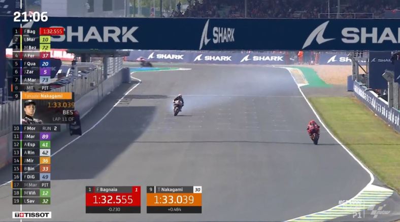 Recordamos o regresso de Danilo Petrucci, suplente deste GP da categoria rainha ao trabalho com alguns testes (aerodinâmica, novo chassis…), mas não sem percalços. Por exemplo, uma queda inesperada de Marc Marquez na curva 11, com alguns danos no RC-V. Um abrandamento nos trabalhos, uma vez que Márquez já tinha anunciado que tinha de compensar os testes perdidos em Jerez devido à lesão, falou-se no geral do chassis KALEX. Esse não é o único problema: também temos uma evidente “fumaça branca” na Honda de Takaaki Nakagami, que inicialmente nem percebe, e finalmente para.