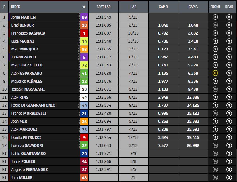 Francesco Bagnaia auf der Pole-Position, Marc Marquez trickste in der letzten Minute nur um 58 Tausendstel aus. Die Aprilias geraten dann im entscheidenden Moment des Qualifyings in Schwierigkeiten. Werden sie das in diesem Rennen wettmachen? Werden die KTMs eintreffen oder, allgemeiner gesagt, werden wir andere Überraschungen erleben? Wir werden auch sehen, ob es den Yamahas gelingt, den Schaden zu begrenzen … Schauen wir uns in der Zwischenzeit die Auswahl der Reifen an, die diesmal viel abwechslungsreicher ist und Aleix Espargaro mit der Hart-Weich-Kombination einzigartig macht. Savadori, Nakagami, Binder, Miller, Folger, Quartararo und Morbidelli wählten Mittelweich, alle anderen schießen mit Doppelweich.