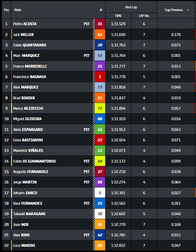 Pedro Acosta prêt à rugir dans le GP de France ? Il a été le meilleur lors de la première séance de dimanche et de la dernière en MotoGP avant le long week-end de course au Mans. On peut parler d’un doublé KTM, puisque Jack Miller occupe la deuxième position, tandis que le top 3 est complété par le protégé local Fabio Quartararo, qui était déjà en action hier avec une combinaison spécialement colorée pour son GP. Chez Ducati, cependant, le mystère demeure quant à la véritable cause de l’abandon de Francesco Bagnaia en Sprint, aujourd’hui en quête de rédemption. En attendant, voici comment s’est déroulée la journée du matin sur le Circuit Bugatti.