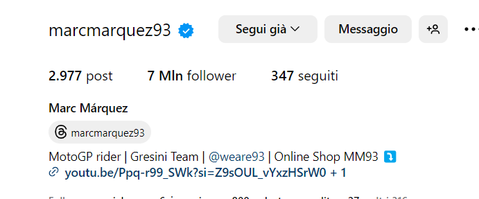 Plutôt éloquent, non ? Avec la “Gresini Team” qui est apparue dans sa bio sociale. Le 20 janvier prochain ce sera le tour de la présentation proprement dite à Riccione, nous verrons pour la première fois Marc Marquez sous les couleurs Gresini de 2024. À partir de ce moment-là, nous commencerons à devenir vraiment sérieux.
