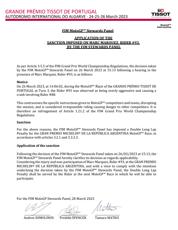 La mise à jour s’accompagne de l’ajout d’un paragraphe dans l’avis d’amende. Lisons en particulier la clarification concernant le moment où cela sera appliqué. Nous rapportons l’article sur le sujet dans son intégralité. “Compte tenu de la blessure et de l’absence de Marc Marquez au Grand Prix d’Argentine, afin de respecter l’intention derrière la décision prise par le Collège des Commissaires FIM MotoGP, la double pénalité pour long tour sera purgée par le pilote lors de la prochaine course à laquelle il pourra participer.