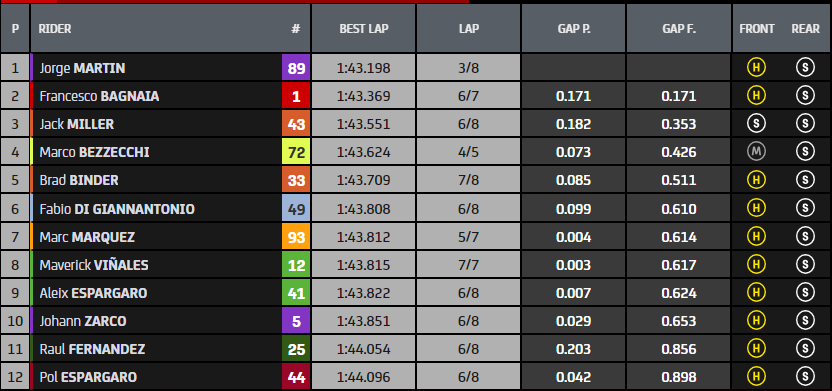 Une seule moto japonaise en Q2 à domicile, celle de Marc Marquez, mais Marco Bezzecchi ne démarre pas bien, étant victime d’une chute à grande vitesse au virage 12 du tour aller. Il se lève sans problème et court au garage pour récupérer la deuxième moto, tandis que Martin prend bientôt la tête du classement, peu de temps après avoir également établi un nouveau record absolu en MotoGP. Brad Binder n’a pas pu se réjouir, le porte-drapeau Pramac Ducati a considérablement réduit son temps (291 millièmes !) et a terminé en tête. Et il restera là, personne ne pourra faire mieux, donc la pole est à lui. Le champion du monde MotoGP en titre et Jack Miller (également célébré en parc fermé par les hommes Ducati) complètent la première ligne.