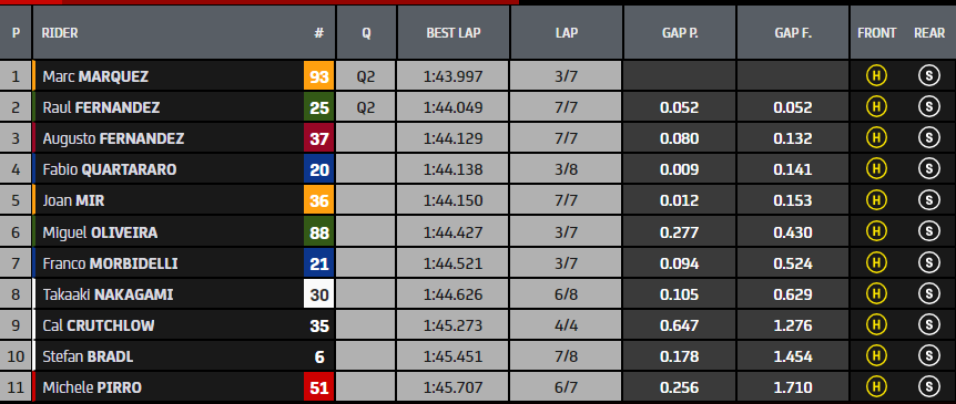 Tous les pilotes des marques japonaises sont présents à ce premier tour de qualification. Encore une démonstration des difficultés de Honda et Yamaha, cette fois à domicile… Mais leurs hommes de tête respectifs, Marc Marquez et Fabio Quartararo, ont pris la tête de la séance, prenant provisoirement les deux premières positions utiles. Tous deux quitteront ensuite le garage en tandem pour les ultimes tentatives, mais aucun d’eux ne fera mieux. Mieux dit, à la fin, Quartararo a vu un bon tour annulé en raison des limites de la piste. Derrière eux cependant, ils s’améliorent, surtout Raul Fernandez qui remonte à la 2ème place, Joan Mir tente également, avant une chute. L’assaut final maintient Márquez devant, Augusto Fernandez est tout proche mais 3ème, Quartararo termine plutôt 4ème : pas de Yamaha au deuxième tour de qualification MotoGP.