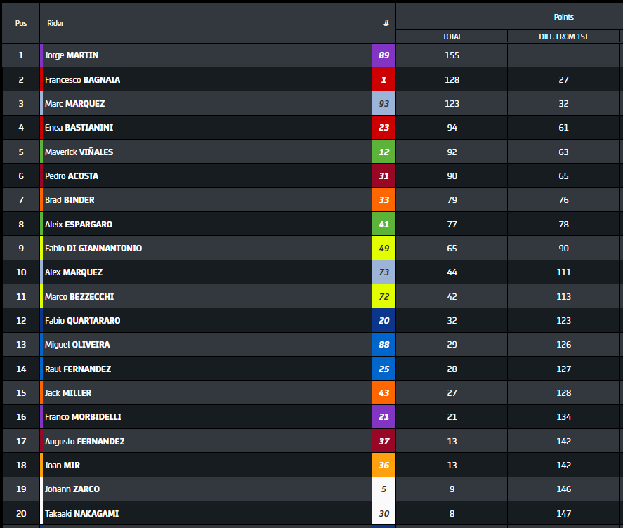 Na briga pelo 2º lugar os dois se chocam e o #23 sai vitorioso. Ele começa de novo, mas só consegue levar sua Ducati de volta para a garagem e se aposentar. Enquanto isso, Bagnaia tenta uma pequena fuga na frente, enquanto Marc Márquez completa a captura de Martin, ultrapassa-o e coloca o campeão de MotoGP na mira. Mas uma reviravolta, o piloto da Pramac caiu pouco depois em San Donato! Acosta, que se livrou de Binder anteriormente, já está “promovido” ao pódio, mas o foco está nos dois primeiros, já que Márquez tenta diminuir a diferença para Bagnaia. Não consegue, o campeão de MotoGP tem margem suficiente para cruzar a linha de chegada sem problemas e voltar à vitória! Marc Márquez volta a confirmar-se com este segundo lugar, assim como Pedro Acosta que sobe um novo lugar no pódio.