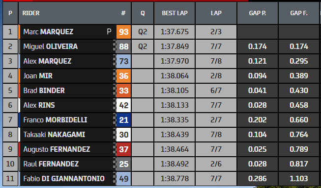 Jako vždy jsou pro dosažení Q2 užitečná pouze první dvě umístění. Všechny Hondy jsou tady, Marc Marquez nepřekvapil, ale číslo 93 se objeví okamžitě. Nejenže se ujímá vedení, ale také podepisuje nový absolutní rekord! Za ním jde Miguel Oliveira, tlačený domácím publikem přítomným na tribuně. Končí to takhle? Ne tak docela, všechno je znovu rozhodnuto závěrečným útokem, bez Marca Marqueze, který zůstal po svém superkole v garáži. Alex Marquez je dočasně za ním, ale domácí jezdec nemá v úmyslu být vyhozen: poslední kolo a k radosti svých fanoušků obsadil 2. místo.