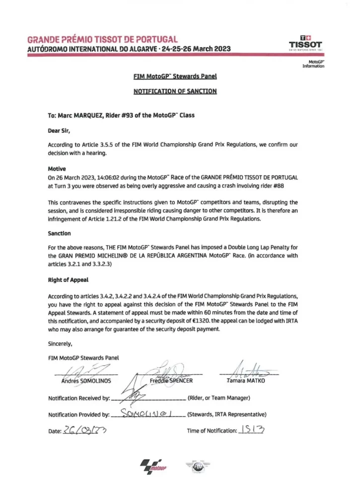 Po nehodě v Portimau nadále převládá spor o Marca Marqueze. Panel stewardů FIM MotoGP udělil jezdci týmu Repsol Honda dvojitý trest za dlouhé kolo, který si odpyká v Argentině po jeho riskantním manévru proti Miguelu Oliveira v GP Portugalska. Španěl vynechá etapu Termas de Rio Hondo kvůli zranění ruky a mohl by se tak vyhnout výkonu trestu. Hypotéza, která jistě přiměje zasvěcené diskutovat.