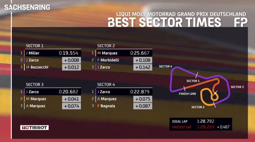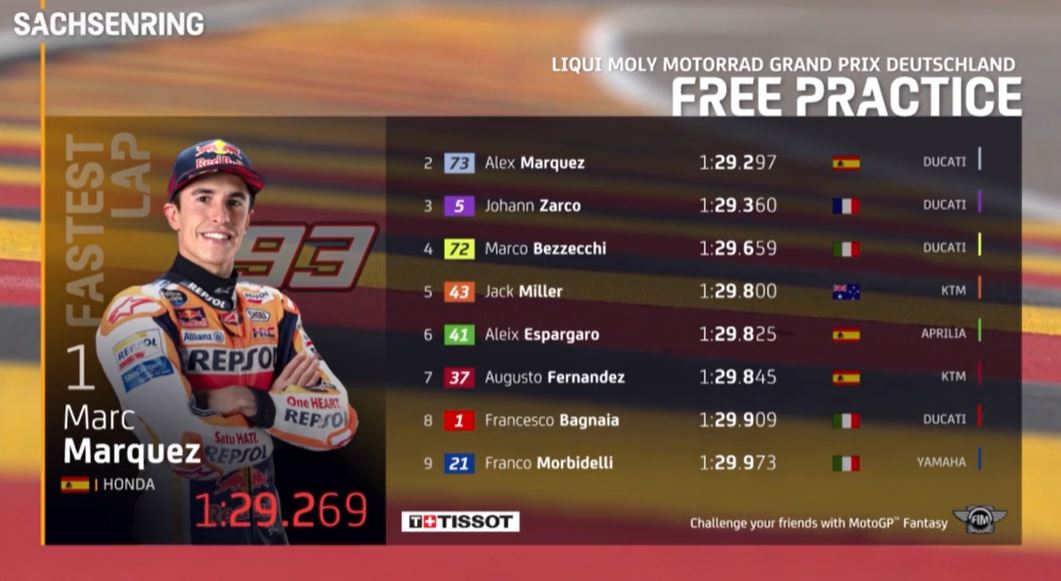 Mungkin ada kekacauan lain di awal sesi ini. Namun kali ini karena kesalahan Marco Bezzecchi yang tiba-tiba melambat di lintasan pada tikungan 12. Marc Marquez yang mengejar saat itu membatasi kerusakan dengan sedikit kontak tanpa konsekuensi lain. Sebuah peringatan telah tiba untuk uskup VR46: “Sedikit terlalu banyak” demikian komentar Pablo Nieto kepada motogp.com. Tidak lama kemudian, ada juga risiko besar bagi Fabio Quartararo di tikungan 5, yang sekali lagi menunjukkan kesulitan bagi semua pebalap dalam kondisi tersebut. Sachsenring bagaimanapun membaik: hujan telah berhenti dan seiring berjalannya waktu “garis kering” sedang dibuat. Pada akhirnya, kedua bocah Marquez itu memimpin di sesi yang masih basah ini, disusul dua pebalap Ducati lainnya.