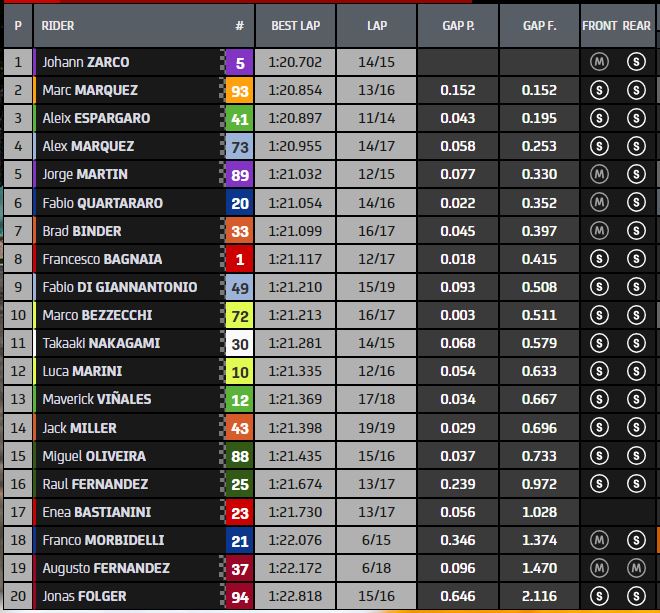 Sementara itu, Zarco segera menempatkan dirinya sebagai salah satu protagonis dari sesi pertama ini di Sachsenring, dengan memasukkan juga Quartararo dan terutama “Raja Cincin” Marc Marquez (11 kemenangan dalam 11 GP terakhir diperdebatkan ). Dia adalah orang yang mengambil banyak risiko di tikungan ke-7, namun menghindari kemungkinan highside dengan jarak sehelai rambut. Sesaat sebelumnya, kecelakaan oleh Aleix Espargaro pada tikungan 1 dilaporkan, bukan awal terbaik setelah cedera yang dideritanya sejak Mugello. Namun, dengan 20 menit tersisa, langit berubah dari mendung menjadi tetesan hujan, meskipun tidak cukup untuk memilih ban hujan. Kondisi kompleks yang membuat sebagian besar pembalap di dalam kotak selama beberapa menit, kecuali Vinales dan Miller yang melakukan beberapa latihan. Tidak bertahan lama, grid MotoGP menjadi liar di menit-menit terakhir untuk memastikan penempatan terbaik. Akhir yang pahit bagi Yamaha: pertama Morbidelli jatuh di Waterfall, kemudian Quartararo terpeleset di tikungan 1.