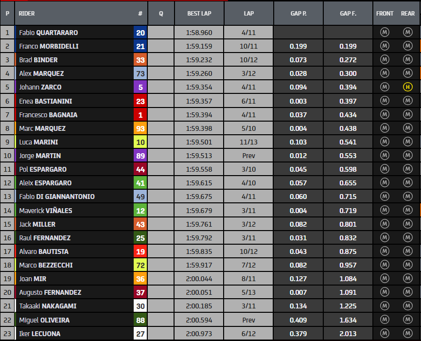 Nous commençons par la première séance, parmi les pilotes en piste il y a aussi Aleix Espargaro, fraîchement sorti de quatre chutes lors de la première journée d’essais à Sepang. Pour son frère Pol, nous avons enregistré une chute à 9 minutes de la fin de la Q1, mais le pilote GASGAS a ensuite réussi à repartir et à concourir pour le reste de la séance. La chute de Marc Marquez quelques secondes avant le drapeau à damier, alors qu’il était de toute façon déjà loin derrière et ne s’améliorait pas particulièrement malgré les sillages, détermine sa 10ème position de la séance, donc la 20ème place sur la grille… Bautista s’arrête sans essence, Di Giannantonio et Bastianini passent en Q2.