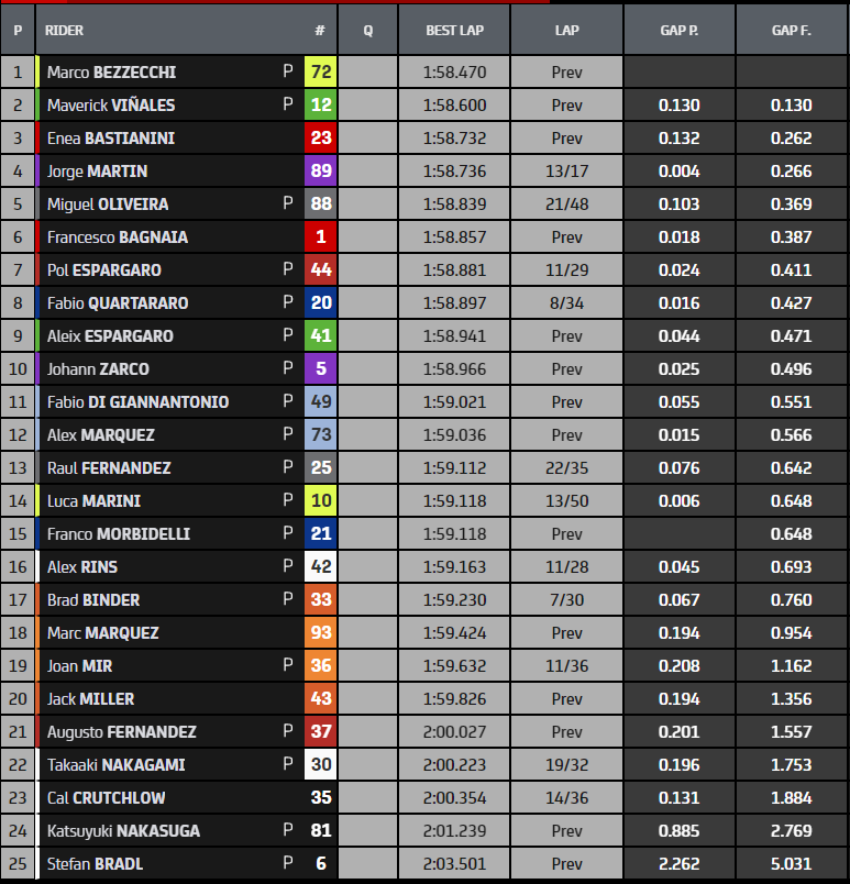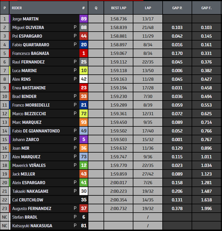Ce n’est pas un jour pour Aleix Espargaro : le matin une chute sans conséquence, l’après-midi un problème technique avec sa RS-GP. Sur la feuille de match un accident chacun également pour Marco Bezzecchi et Jorge Martin.