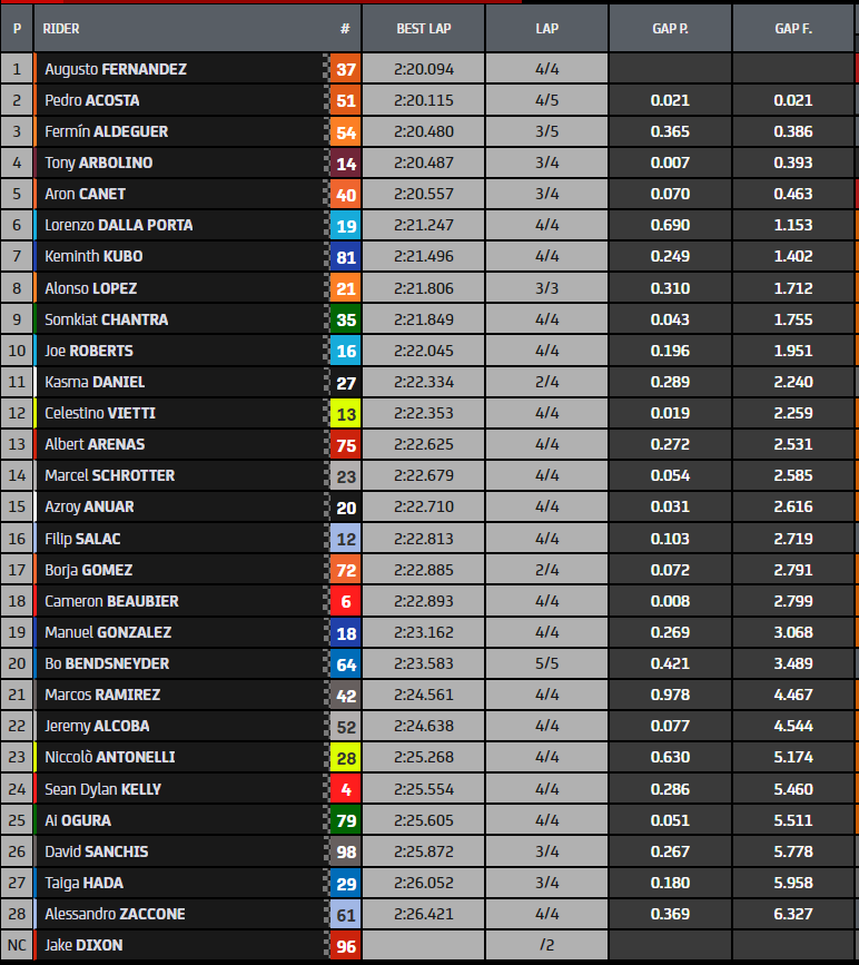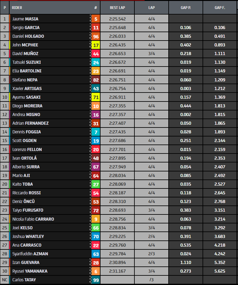 Semua orang pergi dalam kelompok kecuali Andrea Migno, sepedanya membeku sebelum keluar dari pit lane. Pembalap Italia itu segera bergabung dengan dua orang dalam tim: setelah beberapa saat yang heboh, motornya mulai dan dia juga memulai sesi secara teratur. Ban basah untuk sesi terakhir sebelum balapan, cuaca akan menjadi salah satu variabel besar GP ini. 10 menit dijadwalkan berakhir dengan trio Spanyol di atas, sementara poleman Dennis Foggia adalah 14.
