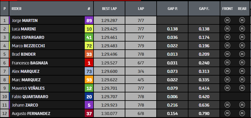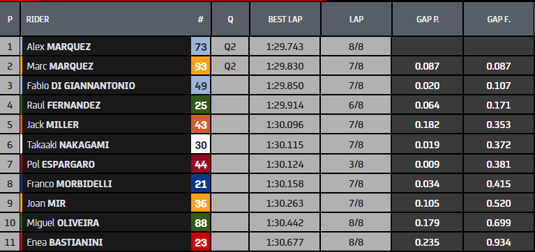 Nous partons de la première séance avec de nombreux grands noms et seulement deux places disponibles… Tout commence par une bataille au sommet entre le présent et le futur de l’équipe Gresini, puisqu’il s’agit des frères Marquez et Fabio Di Giannantonio. Espargaro et Fernandez apparaissent également plus tard, il y a des changements jusqu’au bout, jusqu’à ce qu’Alex et Marc Marquez recomposent le duo de tête, prenant ainsi la Q2.